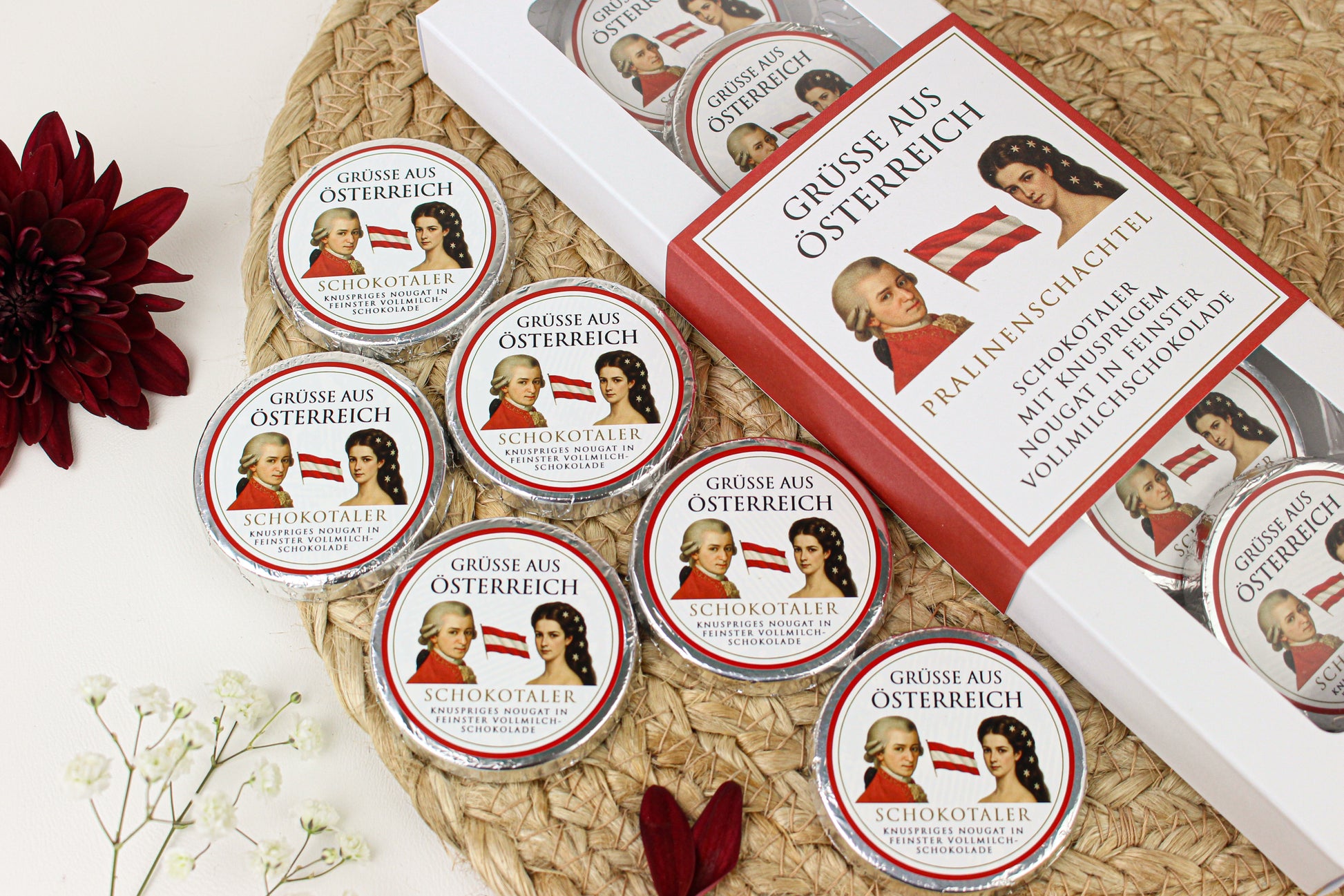 Unsere Pralinenschachtel "Grüsse aus Österreich" besteht aus 6 köstlichen Schokotaler mit einer knusprigen Nougatfüllung in feinster Vollmilchschokolade.